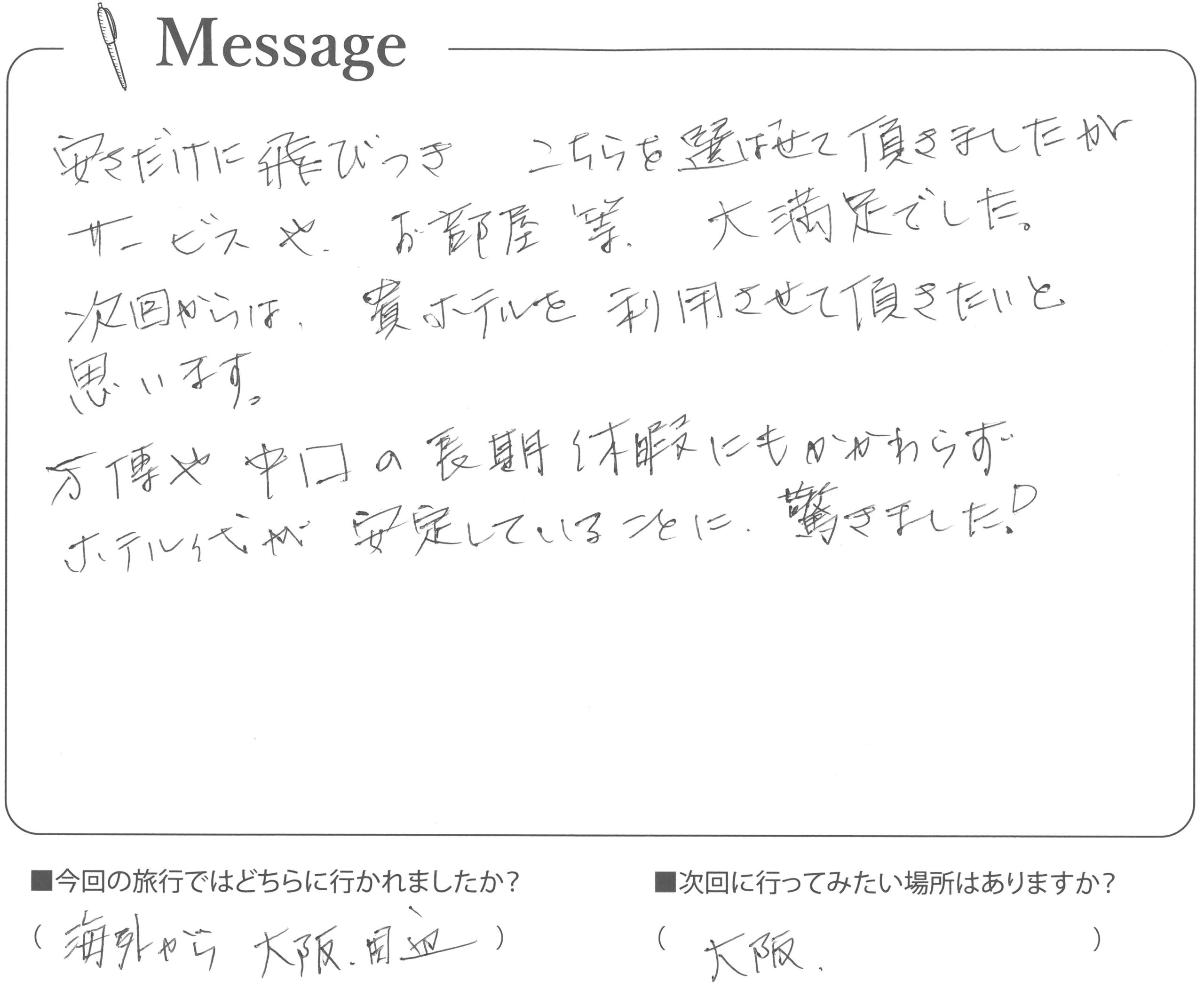 「安さだけに飛びつき、こちらを選ばせて頂きましたがサービスや、お部屋等、大満足でした。次回からは、貴ホテルを利用させて頂きたいと思います。万博や中国の長期休暇にもかかわらずホテル代が安定していることに驚きました!」