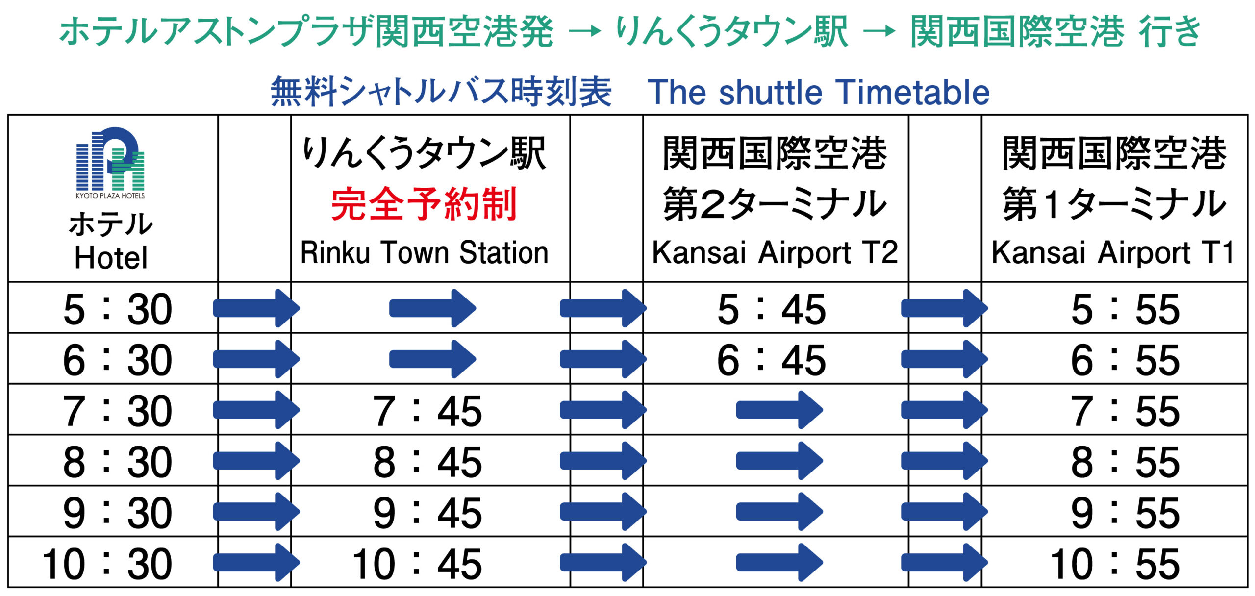 このたび、2025年10月1日より、ホテル発 11:30便(ホテル → りんくうタウン駅 → 関西国際空港 第1ターミナル行き) のシャトルバス運行を終了させていただくこととなりました。